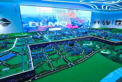 總規(guī)沙盤區(qū)采用了光電升降沙盤,沙盤升起后,側(cè)面展示新型城市地下管網(wǎng),立體化展現(xiàn)了慶陽海綿城市建設的總體規(guī)劃,頂部造型融入慶陽的地形特色——塬,與沙盤造型頂?shù)睾魬?/p>